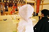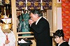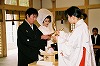 玉串を神前の台の上に奉奠し、御拝礼をしていただきます。新郎・新婦は巫女より玉串を受け、台の上に供てお二人一緒に「二礼二拍手一礼」の作法で拝礼をしていただきます。続いてご媒酌人、ご両親の代表(親族代表)の方に同じく玉串奉奠をしていただきます。 |